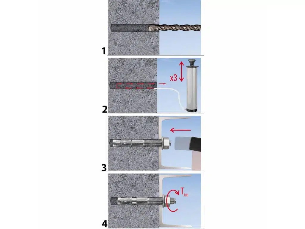 Upevnění se provádí utažením matice příslušným točivým momentem, což způsobí posun dilatačního pásu a vytvoření trvalého ukotvení v podkladu.