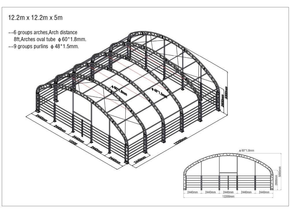 • Pevné trubky spojující segmenty spolu s ocelovými troubami zvyšují odolnost haly vůči větru a padajícímu sněhu.