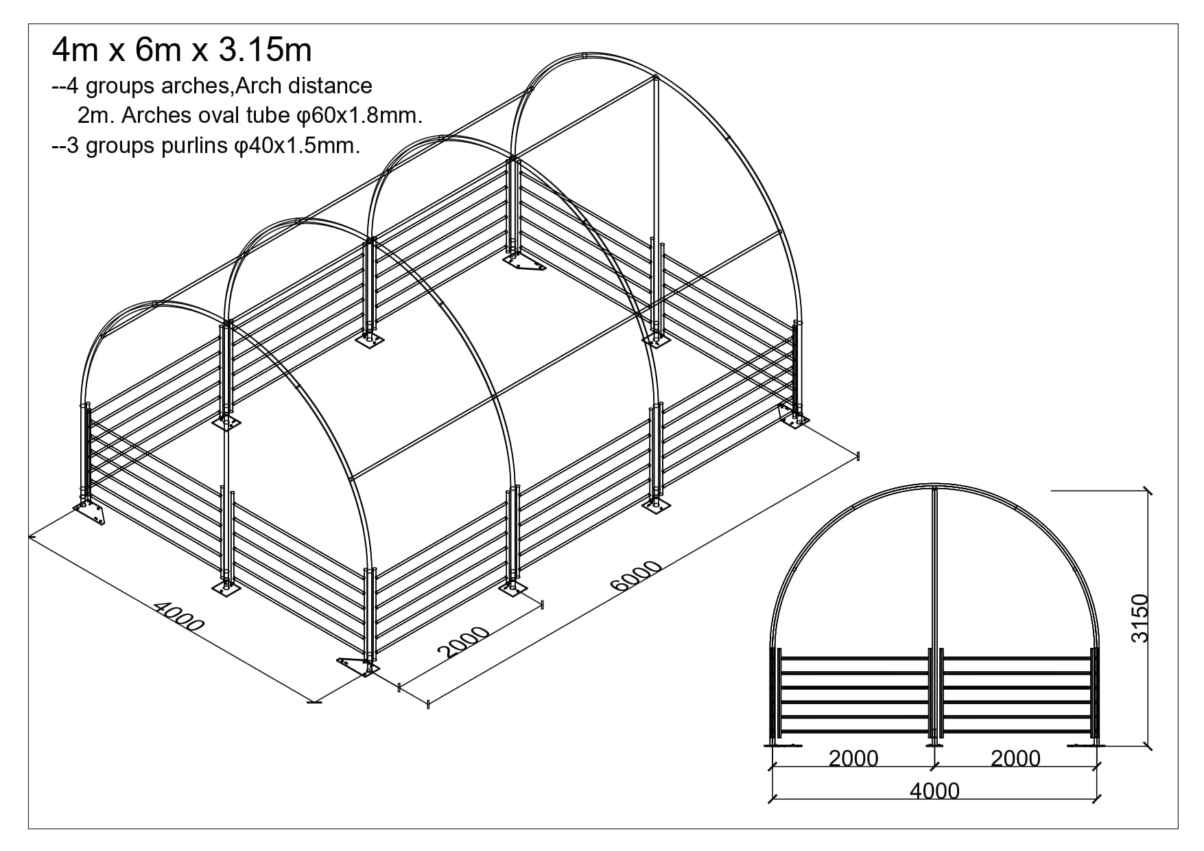 pozinkovaná trubková konstrukce, spojovací materiál, roxorové kotvy do země, střešní a boční plachty, český manuál pro montáž haly