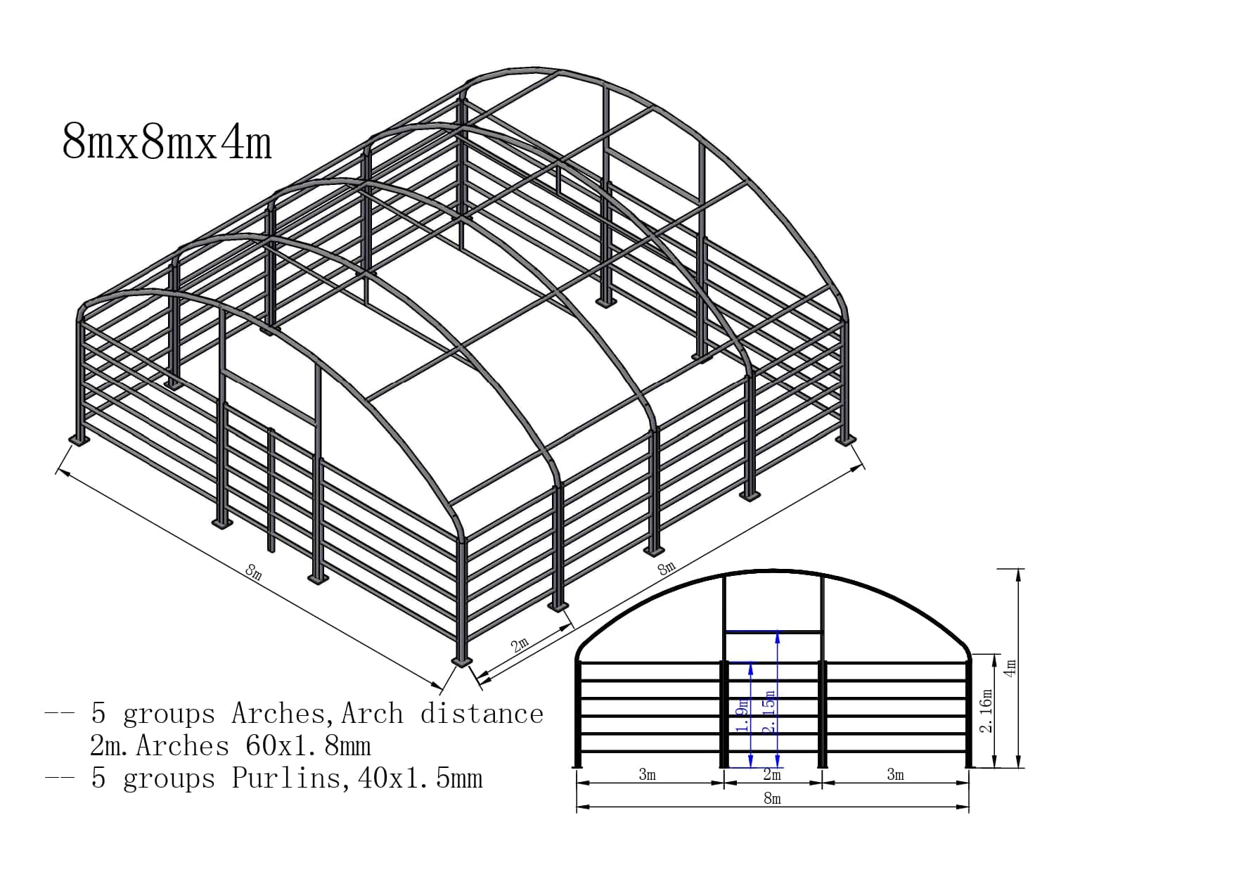 Hlavní konstrukce haly se skládá ze svislých ocelových oblouků, které jsou navzájem propojeny a tvoří tak pevnou a odolnou konstrukci haly