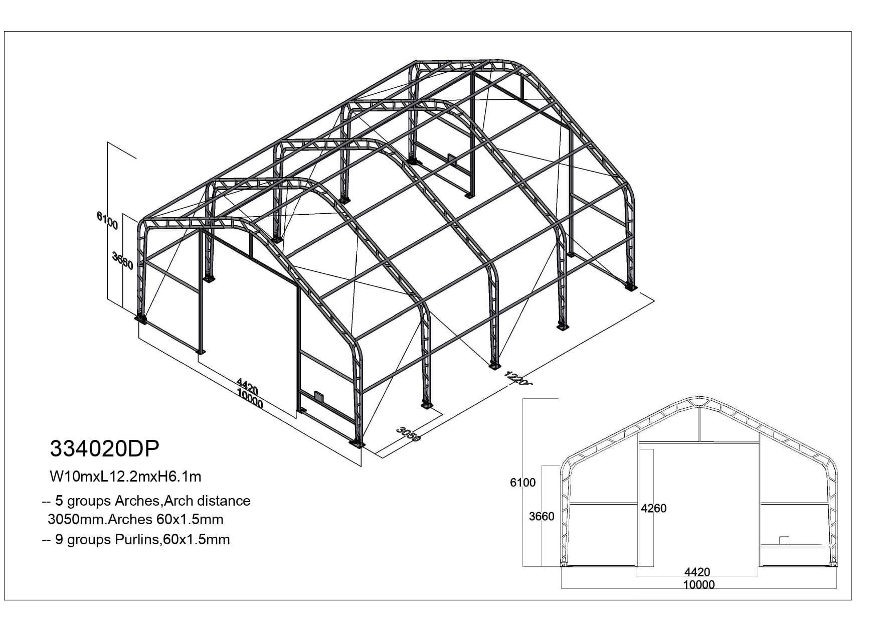 pozinkovaná trubková konstrukce, spojovací materiál, roxorové kotvy do země, střešní a boční plachty, český manuál pro montáž haly