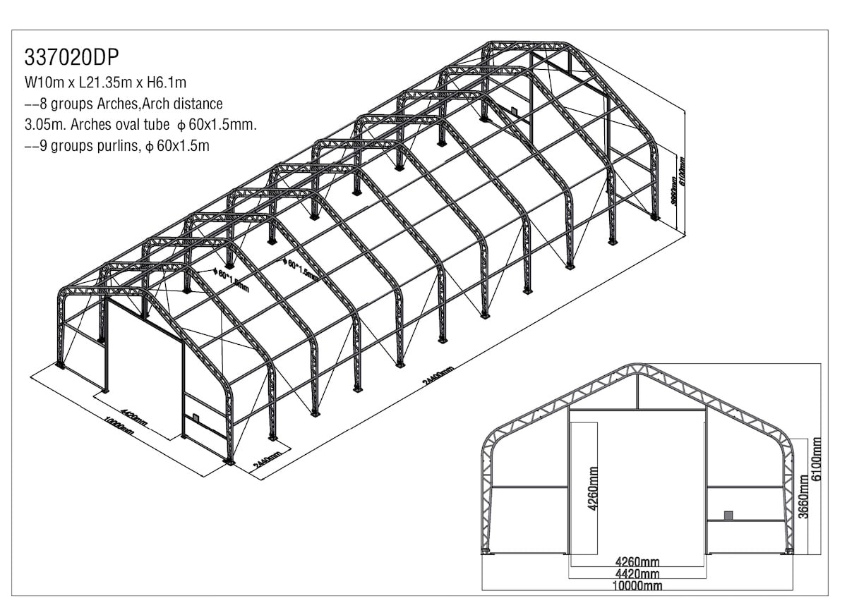 pozinkovaná trubková konstrukce, spojovací materiál, roxorové kotvy do země, střešní a boční plachty, český manuál pro montáž haly