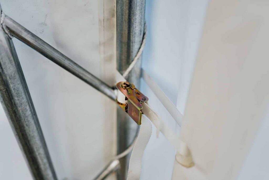 • Následně se plachta prychití lanem o první a poslední oblouk a napne pomocí napínacích pásů a ráčnů.