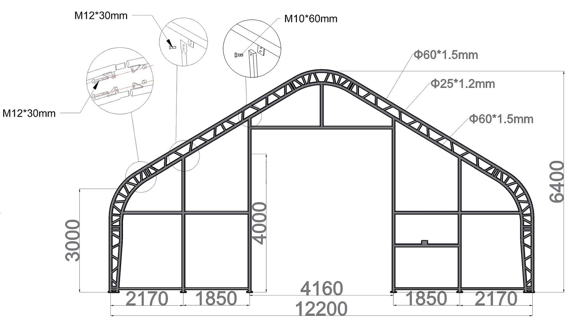 • Pevné trubky spojující segmenty spolu s ocelovými troubami zvyšují odolnost haly vůči větru a padajícímu sněhu.