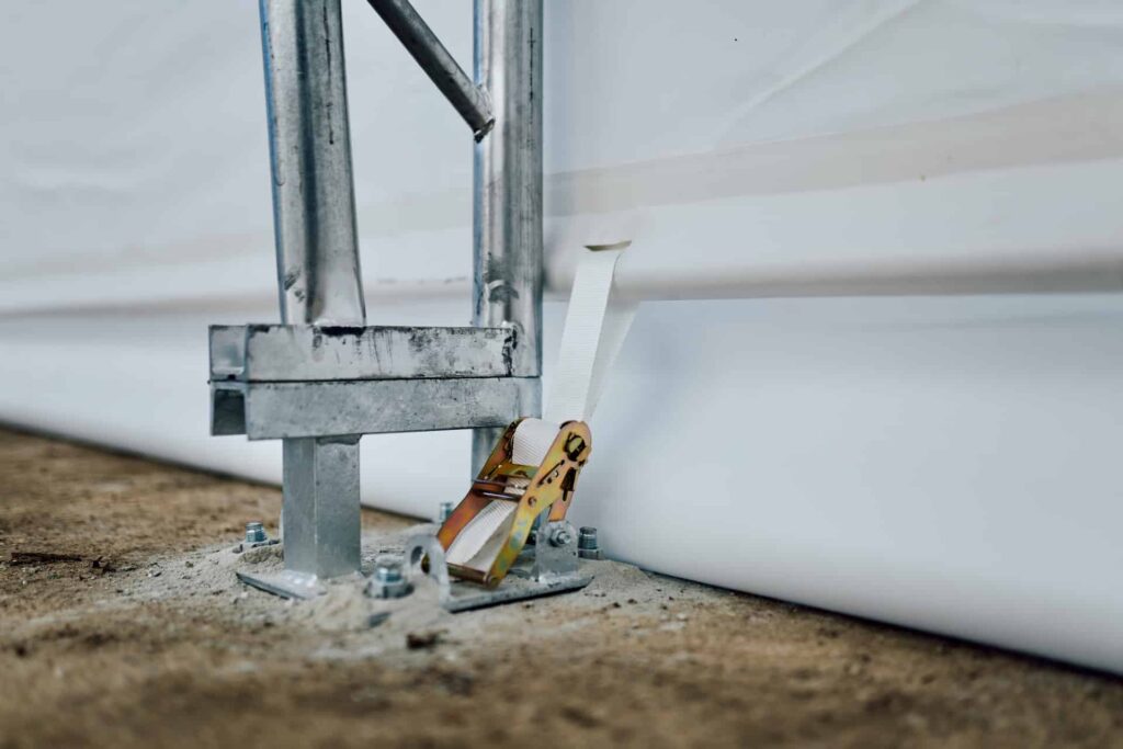 • Hala se kotví pomocí pozinkovaných roxorových kotevních prvků, které se nabijí do země pod specifickým úhlem, díky čemuž zajišťují pevnost a odolnost haly vůči větru