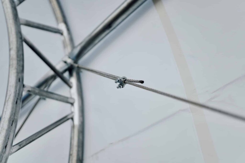 Po sestavení rámu se přes konstrukci protáhne hlavní (střešní) plachta, která se připevní k patkám oblouků pomocí robustního napínacího ráčnového systému.
