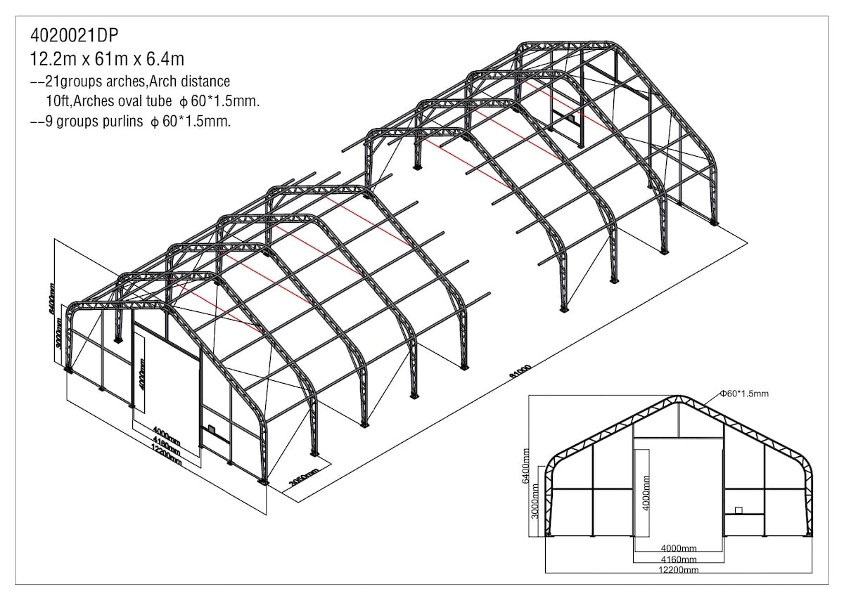 • Pevné trubky spojující segmenty spolu s ocelovými troubami zvyšují odolnost haly vůči větru a padajícímu sněhu.