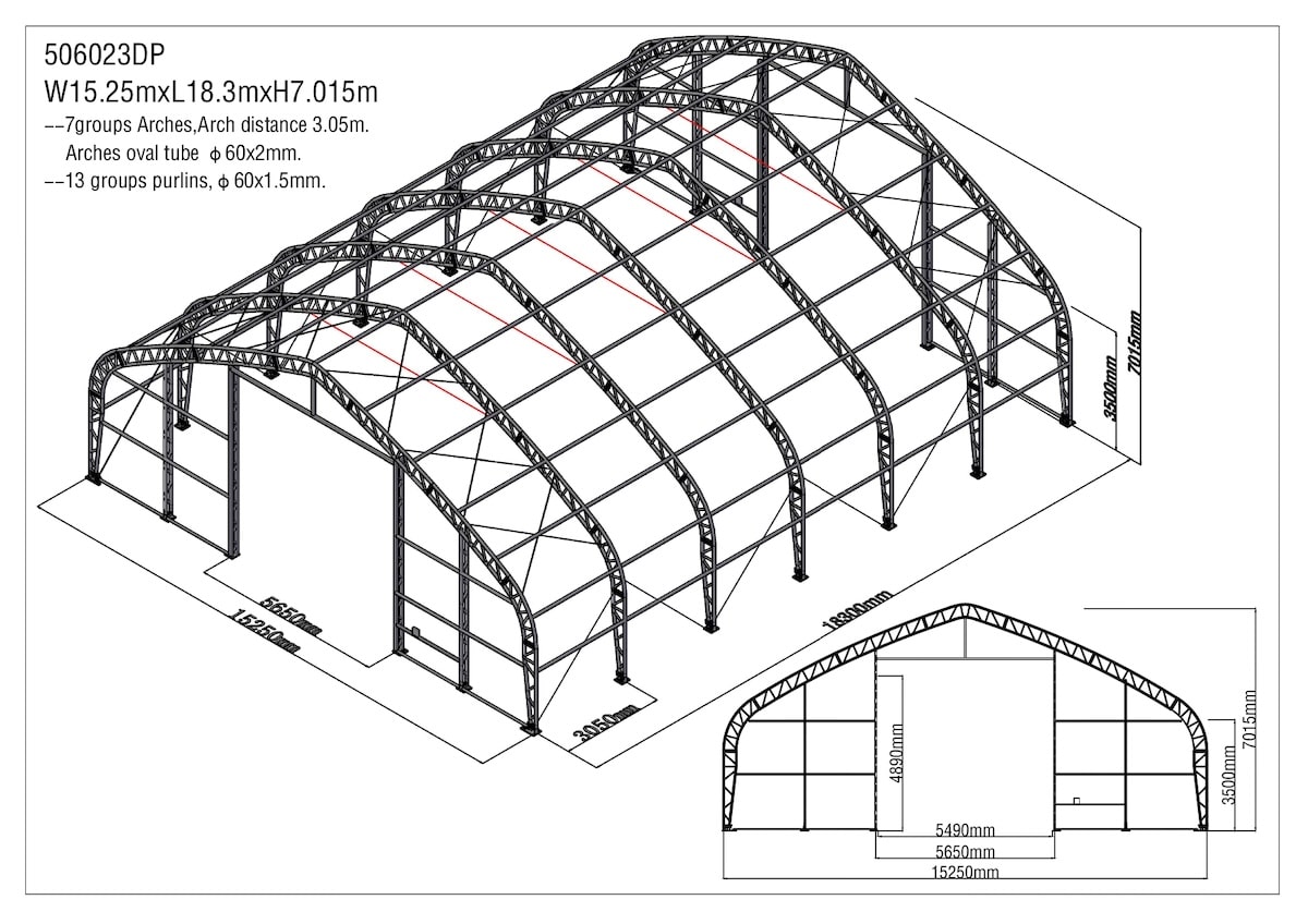 pozinkovaná trubková konstrukce, spojovací materiál, roxorové kotvy do země, střešní a boční plachty, český manuál pro montáž haly