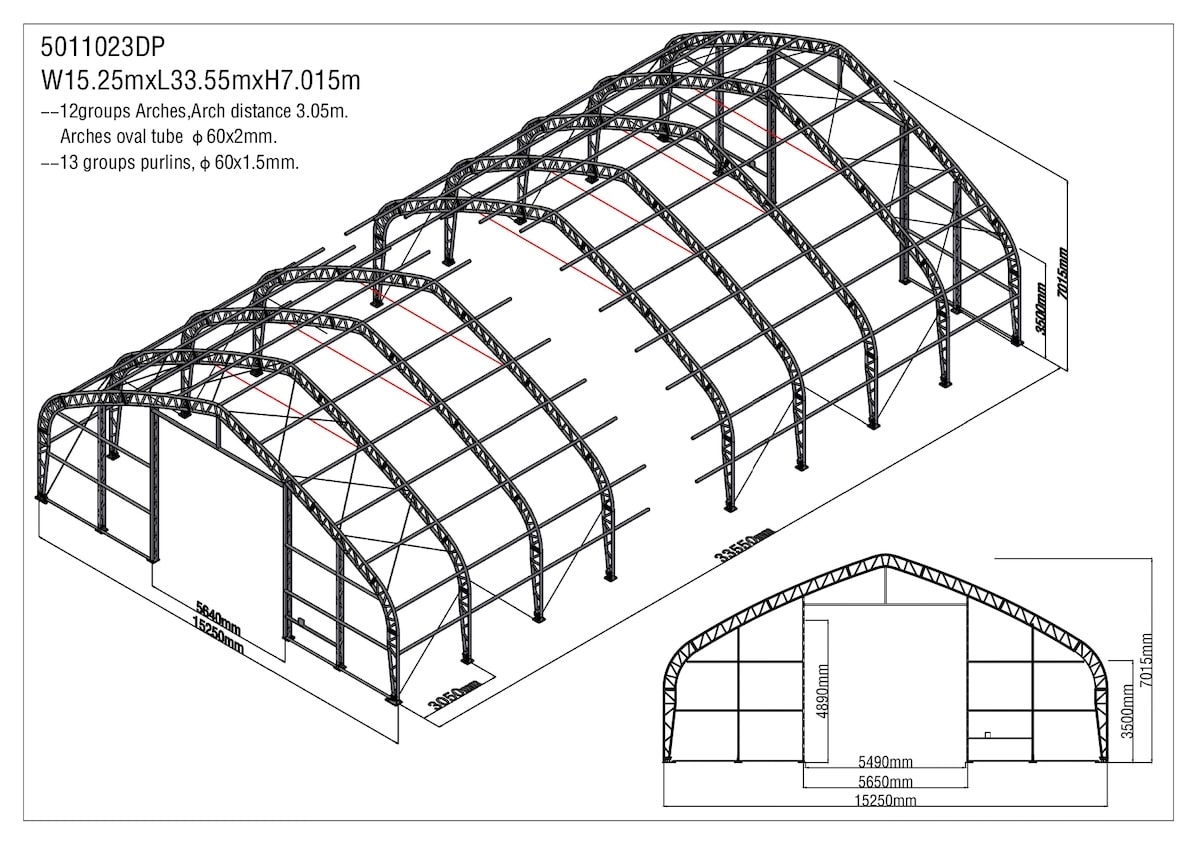 pozinkovaná trubková konstrukce, spojovací materiál, roxorové kotvy do země, střešní a boční plachty, český manuál pro montáž haly