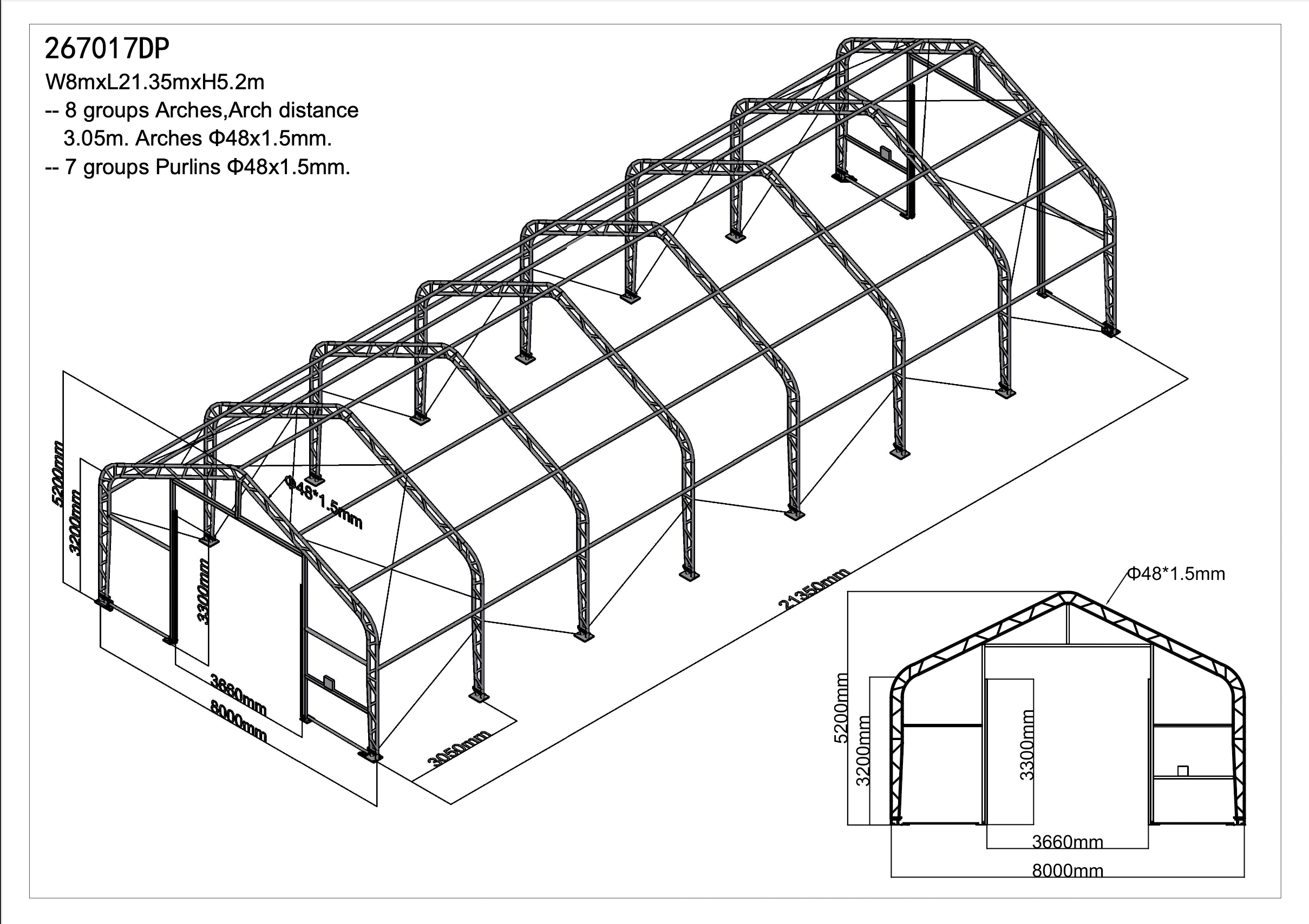 • Průměr trubek: ø 70mm x 42mm (záleží na rozměru haly)