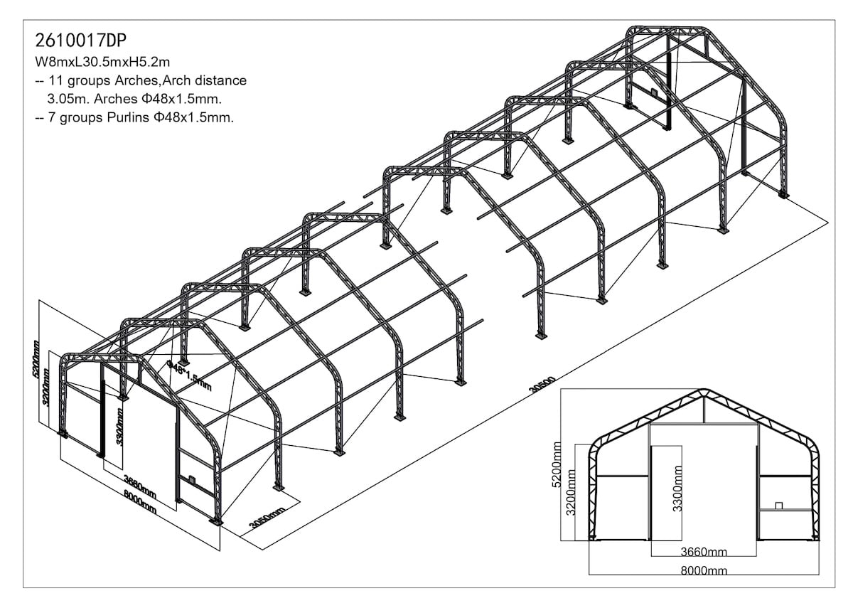 • Průměr trubek: ø 70mm x 42mm (záleží na rozměru haly)