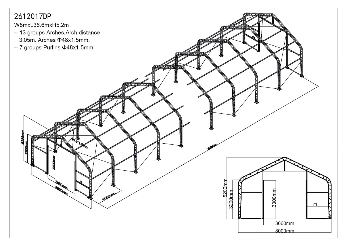 • Průměr trubek: ø 70mm x 42mm (záleží na rozměru haly)